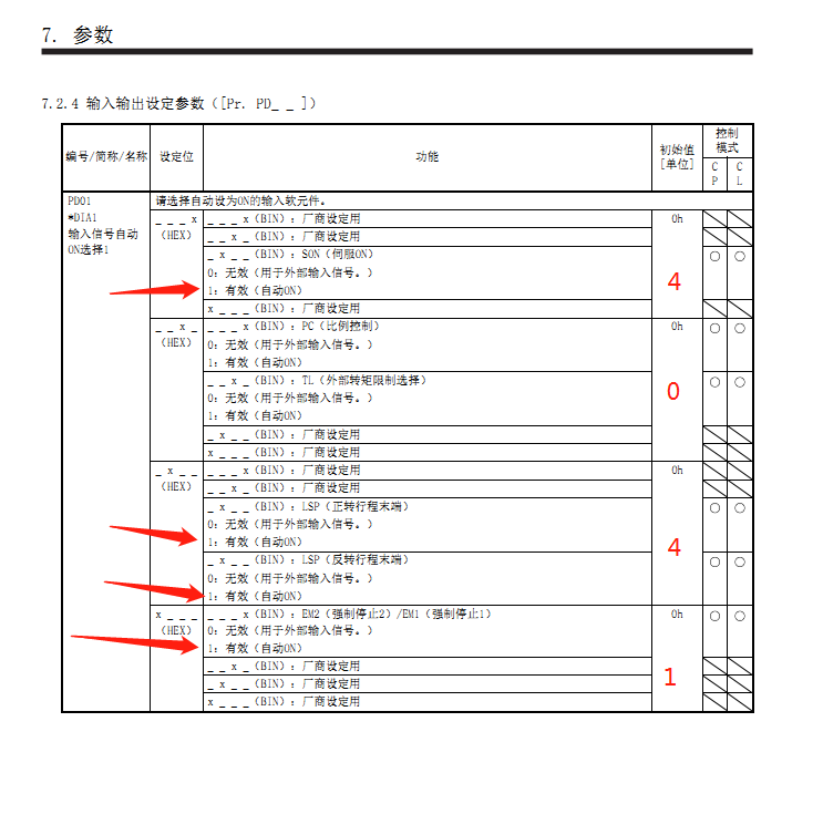如圖:想讓伺服上電就自動ON,正反轉末端,EM2自動ON.,  把  PD01設定為1404是否正確。