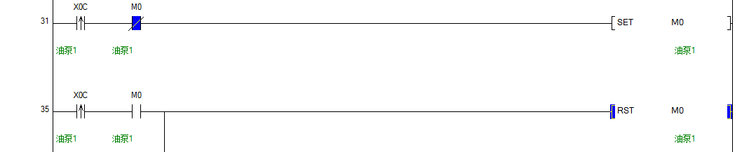 樓主沒有理解SET指令的特征,此例子中SET M0后,M0的常開點在接下來的掃描過程中即時導通,也就是例子中35步的程序,此時啟動按鈕的掃描週期內M0常開點也導通了,造成M0剛置位,掃描到35步程序時馬上又復位了,所以油泵沒啟動。