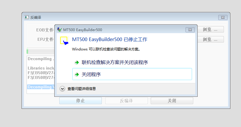 引用引用樓主zz2679493于2018-09-20 11:48發(fā)表的 威綸老款觸摸屏MT506LV反編譯停止工作 :請教一下論壇的大神們,在反編譯的時候每次在同一步就彈出軟件停止工作,是軟件版本問題嗎? [attachment=225931] [attachment=225932]