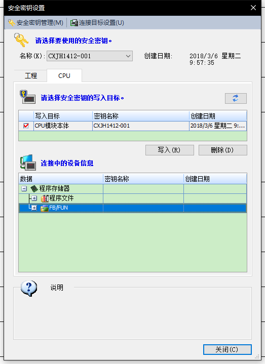 5、多次嘗試后,發(fā)現(xiàn):寫入不帶密匙的程序后,可以通過GXW3刪除CPU的密匙,如圖所示界面;