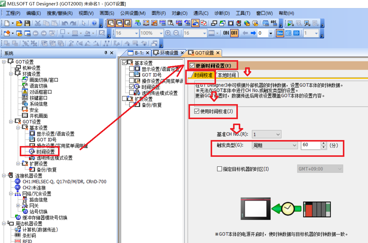 統一使用PLC的時間作為依據。GOT里勾選 使用時間校正 功能