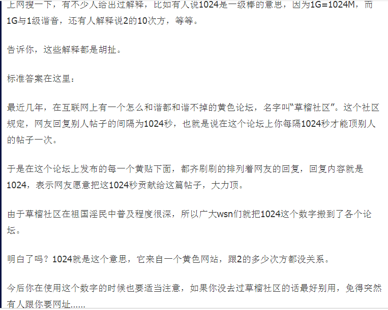 準(zhǔn)確地來(lái)說(shuō)此回復(fù)來(lái)自于一個(gè)名為“CL社區(qū)”的綜合性論壇,因此論壇分為等級(jí)制度,在特定等級(jí)以下的會(huì)員均每隔1024秒可以回復(fù)一次(解讀:除新手上路外,俠客以上(包括俠客)不能直接回復(fù)1024。也就說(shuō),新手上路在發(fā)完一貼后,再在發(fā)下一貼的時(shí)候要等上1024秒后才可以繼續(xù)發(fā)貼。(也可以說(shuō)1024秒除以60秒每分鐘等于17分鐘)解讀為17分鐘后方可發(fā)貼。 論壇這么做的目的,是防止新人在不了解版規(guī)的情況下,惡意灌水、發(fā)廣告、等等。晉級(jí)后便不受1024限制)。在時(shí)間的洗禮中,1024一詞已經(jīng)成為一名CL人必經(jīng)的階段,每隔“1024“秒回復(fù)一次的發(fā)帖資格成為一種可貴的機(jī)會(huì)。因此,主題能夠得到的限制級(jí)1024用戶(hù)的回復(fù)越多,證明了用戶(hù)對(duì)主題帖的肯定。 從而1024延伸到了對(duì)主題的頂帖。和“UP”“頂”“踩”是一樣的頂帖回復(fù)。從而1024成為了新一代的回帖方式,并在逐步流行。