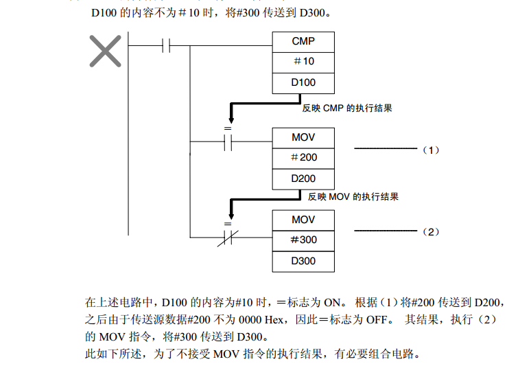 “對于 MOV 等的傳送指令,在傳送源數(shù)據(jù)為 0000 Hex 時將=標志設(shè)為 ON,不為0000 Hex 時將=標志設(shè)為 OFF。因此通過某個指令將=標志設(shè)為 ON 時,如