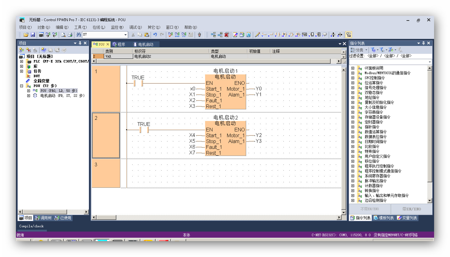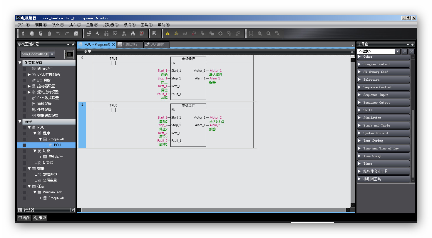 在主程序中OB1調用FB功能塊。賦值實際PLC IO地址