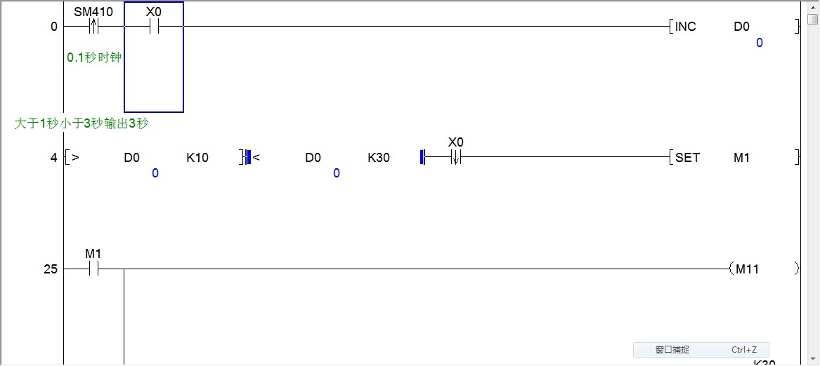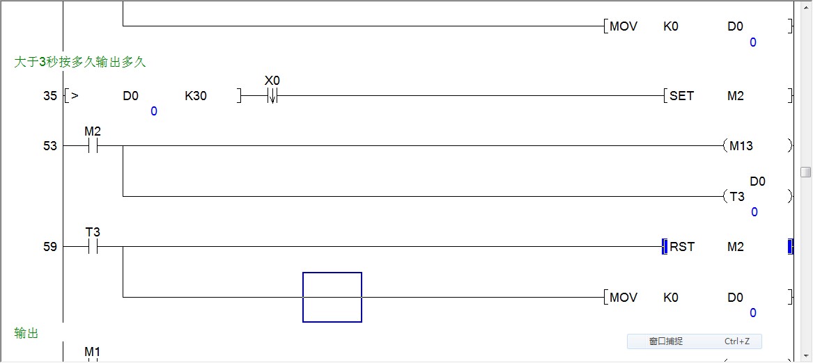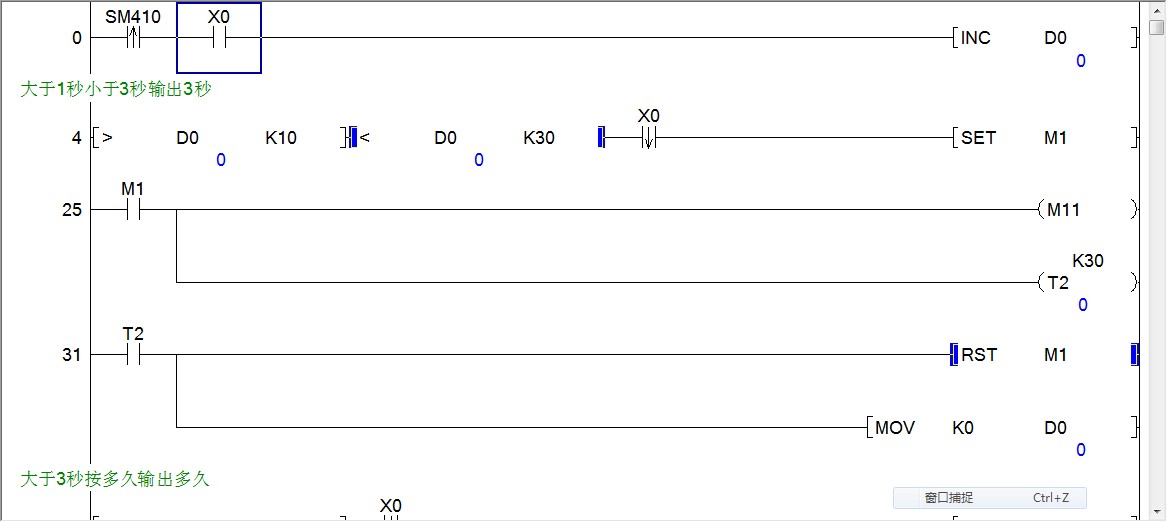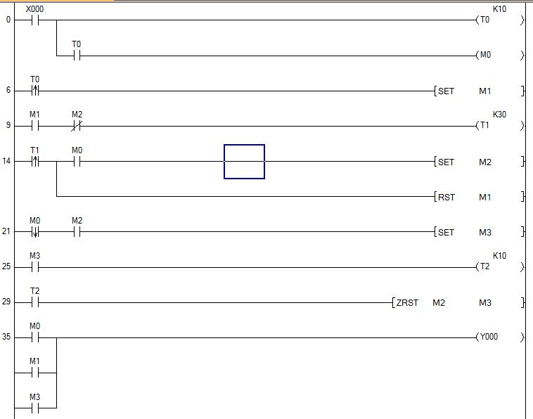 模擬過,可以用。按下1秒后M0動作,M1置位,持續輸出3秒;持續按則M0持續驅動輸出,松開后即延時1秒后停止輸出(彌補開始計時的1S)。