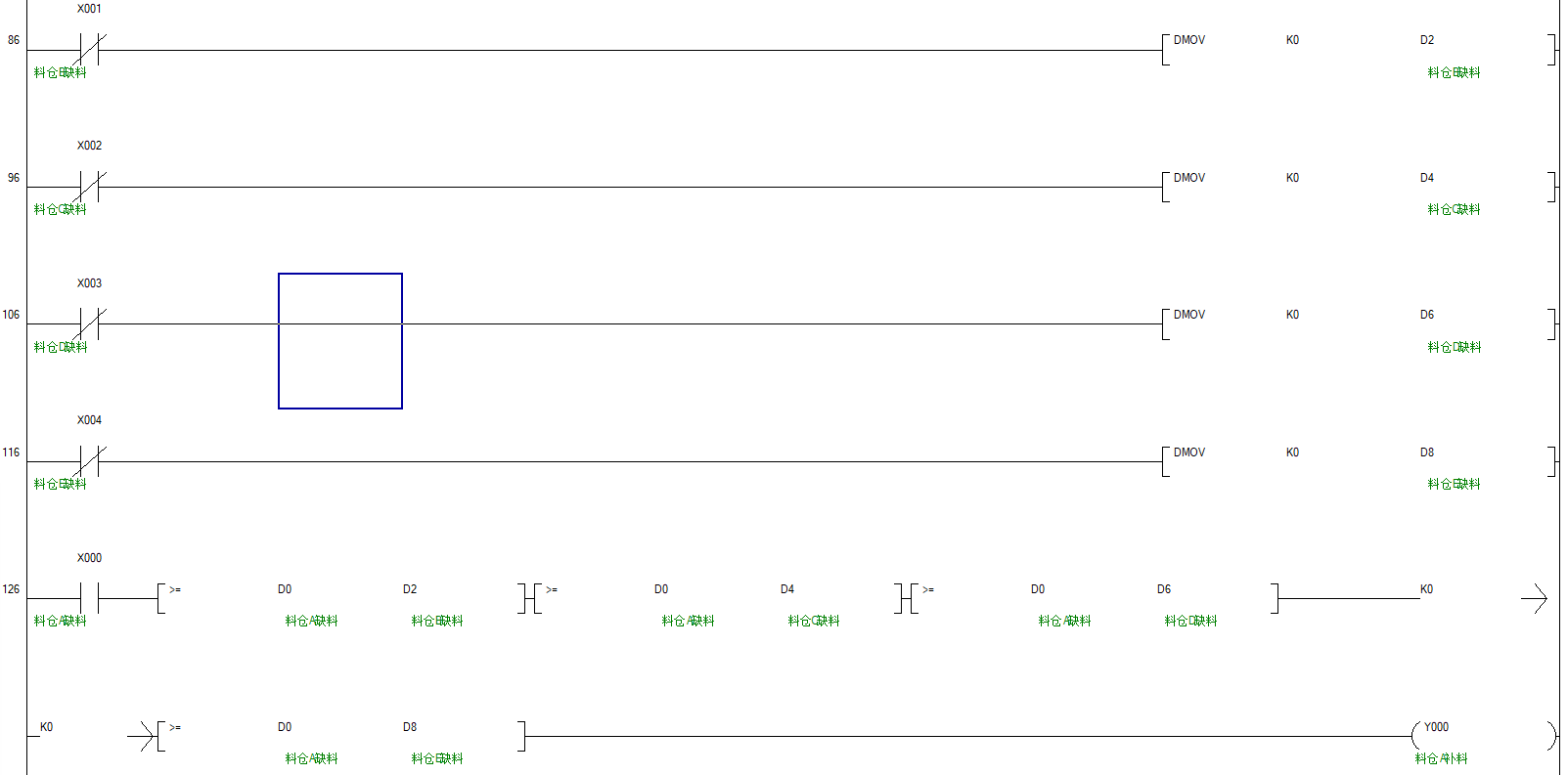 再用流水式比較D0----D4的值屬于哪個倉室,就輸出對應等值一行的繼電器,直到這倉補完料,在切到下一個D值進行比較輸出。