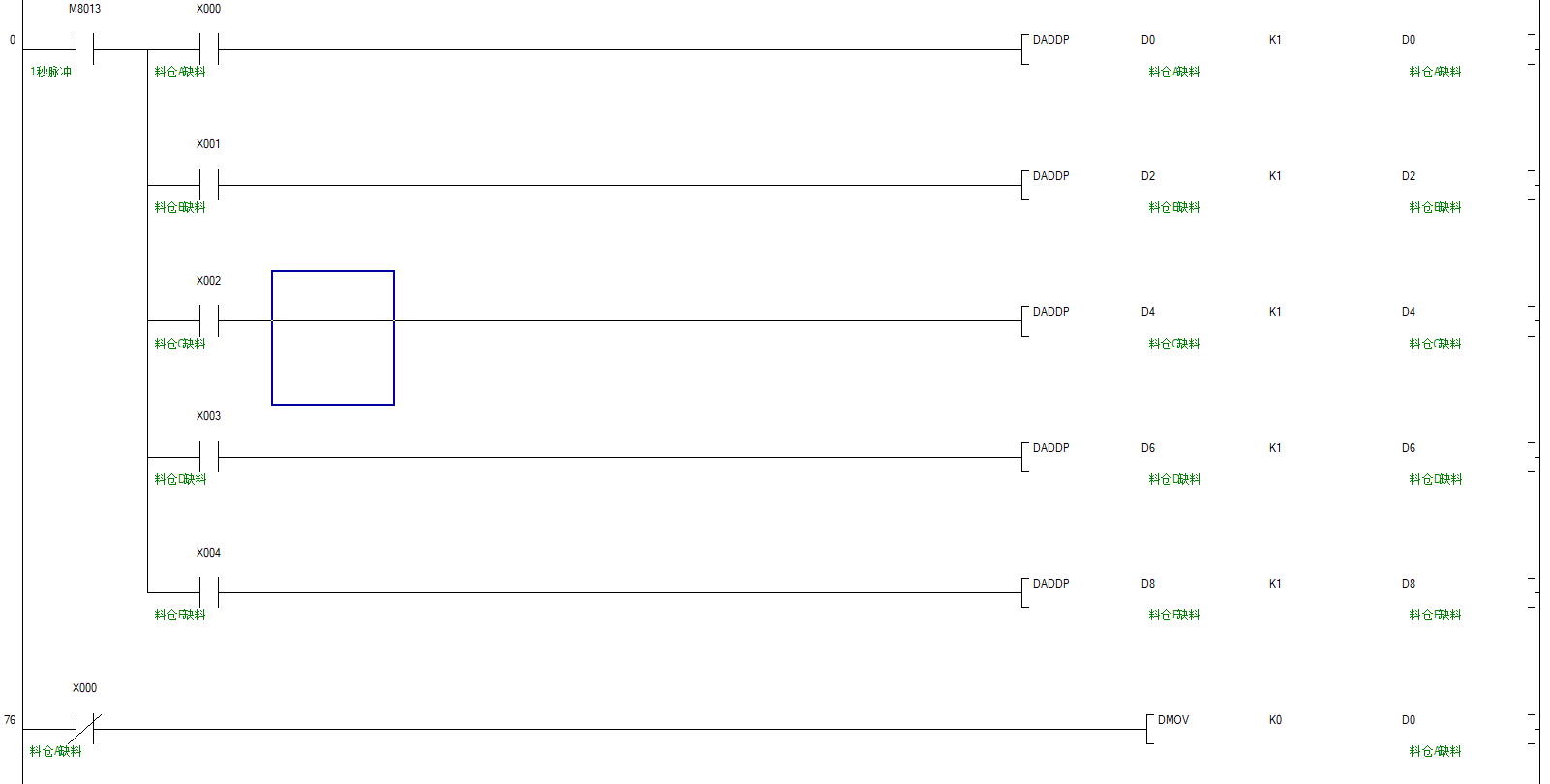 3.就算多個沒料信號同時出現,因程序是掃描執行的,程序先掃到先跳到加料程序,也不會出錯。