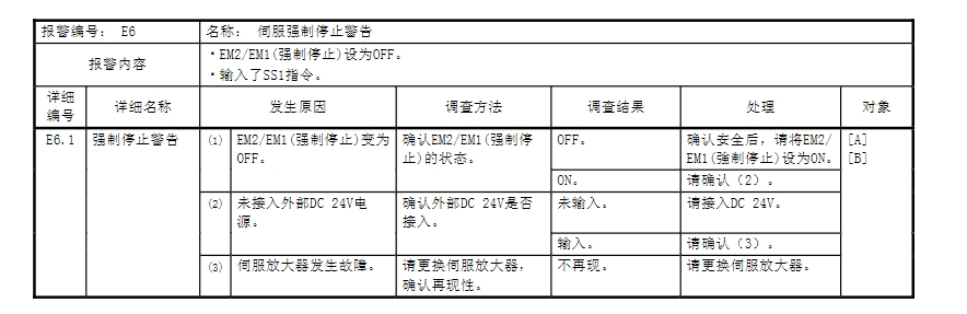 各位大佬,剛接觸MR-JE-40A驅動器,線接好后驅動器報警,報警代碼為ALE6.1,手冊上說是EM1/2未變為ON,或者DC24V未連接,我想問下如何將EM2/1變為ON.直接連24V正極就可以嗎?謝謝