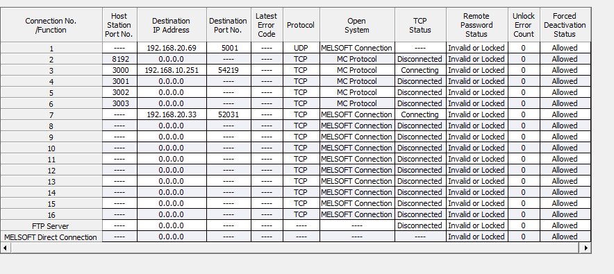 當PC連線了到PLC了,我使用Work 2的網路診斷功能,可以看到port 3000有一組IP占用,這邊沒問題,但是當我將PC端的網路線拔除后,此3000 port 應該要斷線被清除,但原先的IP還是一直占用此3000  port,直到我把PLC CPU訪問路由拔除也還是一樣,被占用造成我的PC就無法再重新連接