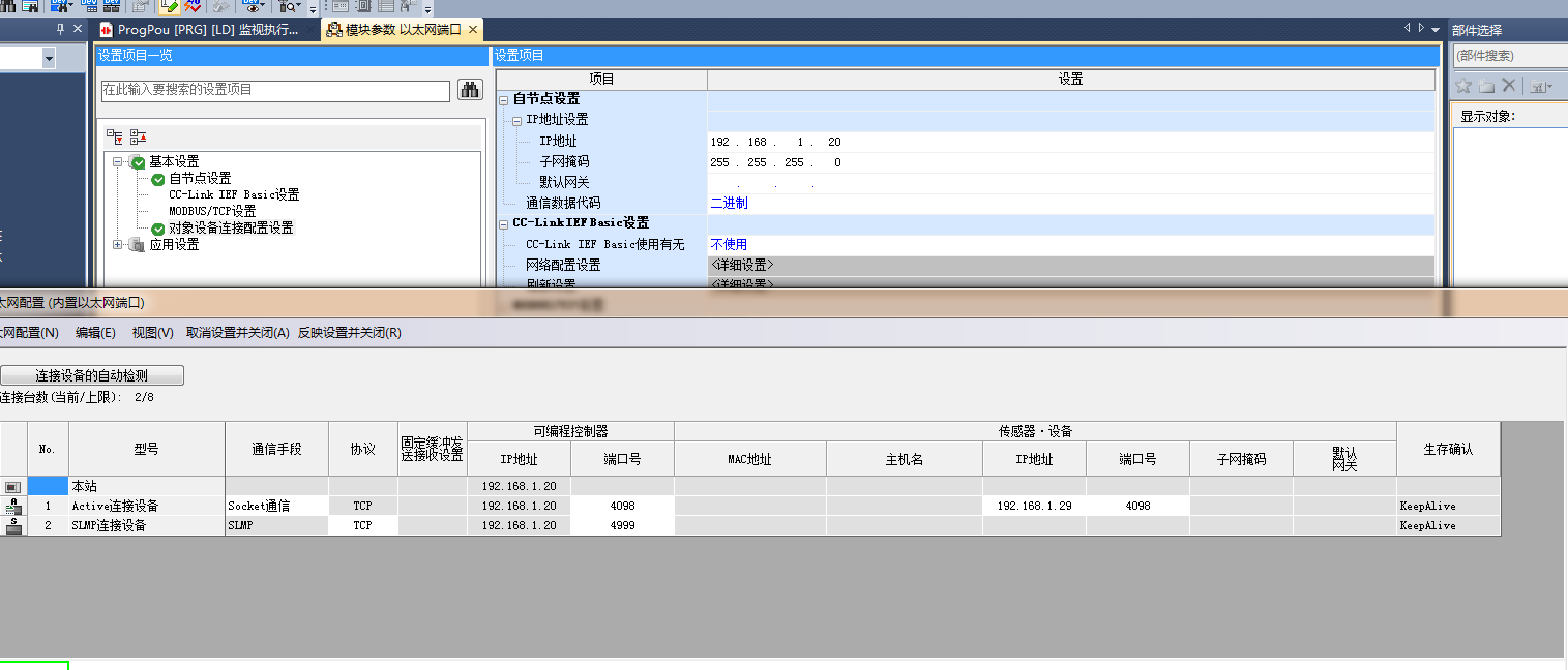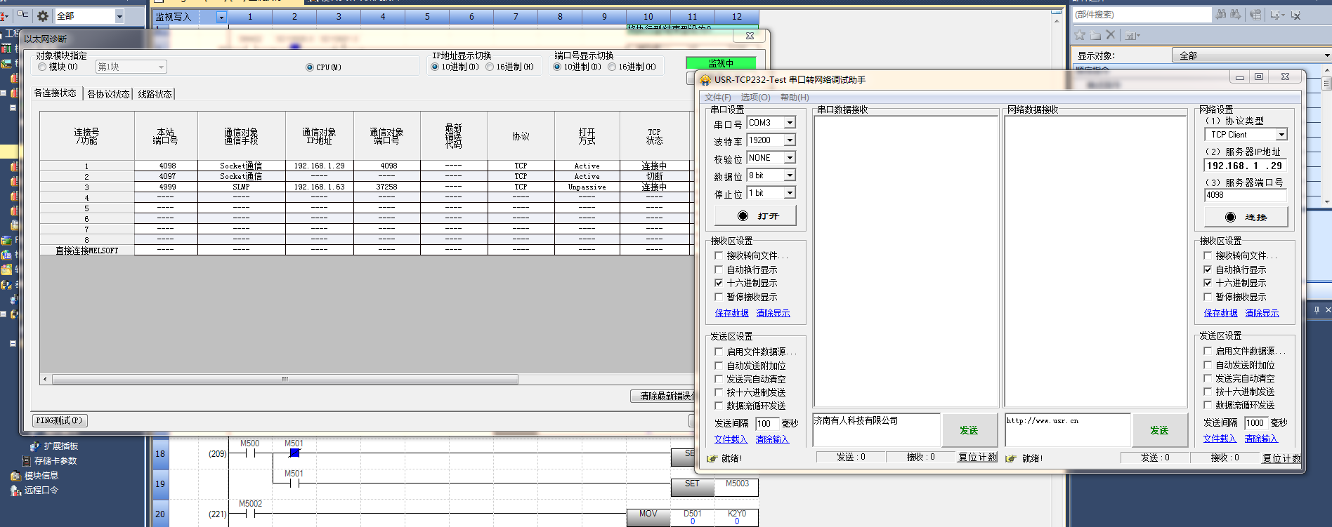 然后我電腦運(yùn)行tcp調(diào)試助手,想模擬上位機(jī)連接PLC,但是怎么也連接不上去哎,下載了很多例子,也按照官方幫助手冊,都不行,不知道哪里出問題了,折騰兩天了,項(xiàng)目急,解決了,私信我,發(fā)紅包哈,謝謝各位