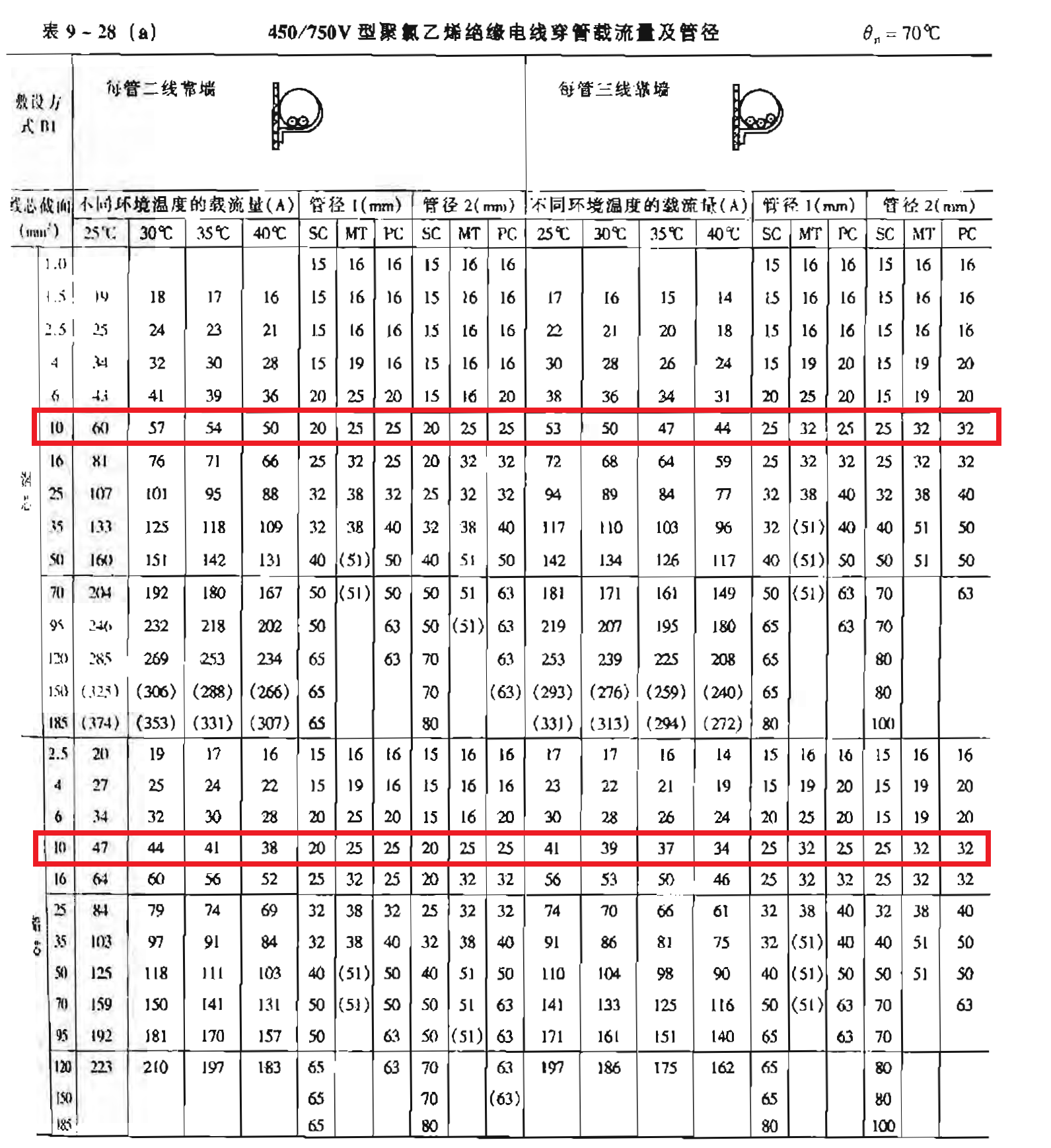 再看看環境溫度和敷設條件改變后的計算結果。仍以10平方毫米的導線為例,當環境溫度不超過35℃、穿管敷設時,經驗口訣選擇法為“穿管溫度八九折”。意思為穿線管敷設只能是原載流量的80%;環境空氣溫度超過25℃的按原載流量的90%計算。如果兩者條件同時達到,則按原載流量的72%計算。