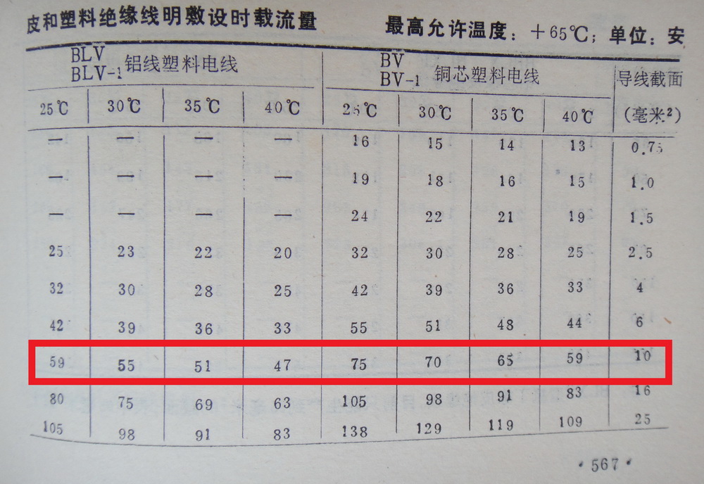 接下來查相關手冊的明敷載流量參數表(見下面附件),我們可以看到,在同等條件下,10平方毫米的鋁芯線和銅芯線的載流量。表中的值都比口訣中的計算都要大(鋁芯線=59A、銅芯線=75A)。也就是說,經驗口訣選擇法除了不滿足技術經濟性的要求外,計算結果完全滿足安全可靠性的要求。