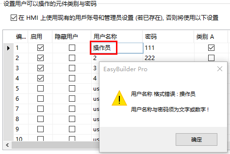 如題所述,威綸通HMI在權(quán)限設(shè)置中,用戶名稱設(shè)置的時候,輸入中文保存時,會顯示出錯的彈窗,是本身不支持中文用戶名,還是其它地方設(shè)置有問題?如果能設(shè)置中文用戶名,該怎么操作?求大神指點。