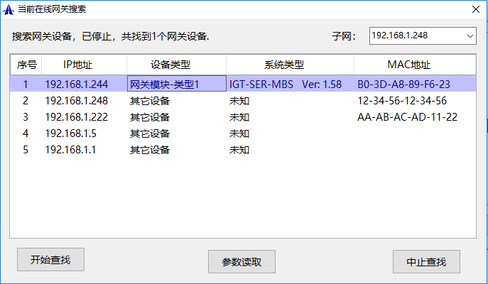 首先,電腦上運行網關的參數設置軟件,通過交換機網線連接到網關模塊,設置電腦的IP地址與網關同網段,網關的默認IP是192.168.1.244,然后通過‘工具’->‘搜索在線網關’搜網關設備: