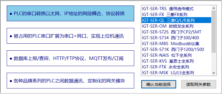 點‘參數讀取’,然后切換網關的系統型號為‘IGT-SER-QL 三菱Q/L/R系列 ’,點‘確認當前選擇’,然后通過‘參數’->‘參數寫入到網關’下載,‘工具’->‘重啟網關’重啟: