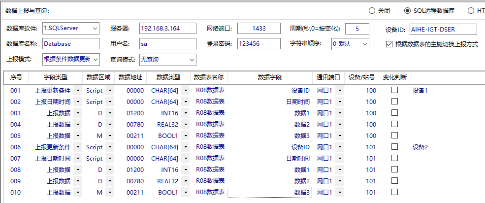 每臺設備一行數據記錄,根據設備ID按周期每5秒更新一次數據表,通過網關的參數軟件設置的數據配置如下: