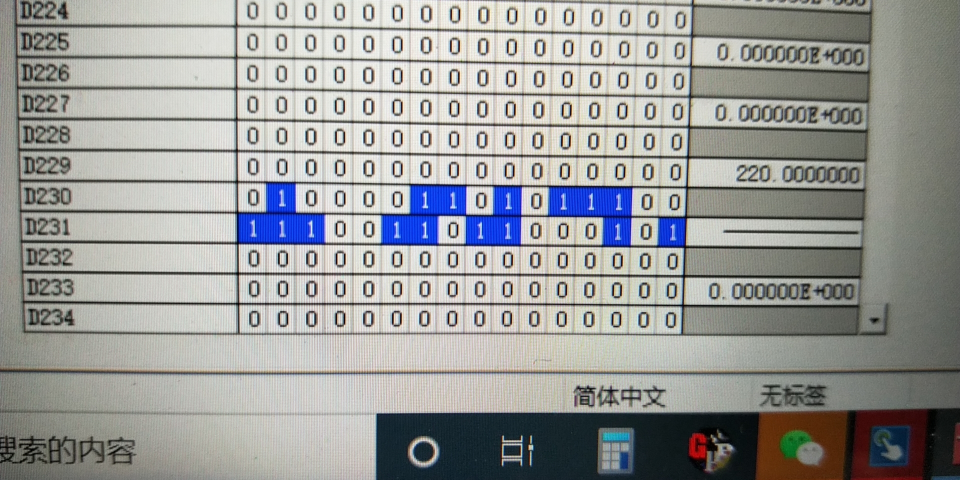 6樓都貼了圖片教程了,直接在觸摸屏里選32位浮點數/Double word. Float,讀取D230,231就行了。你這個是十進制,而且是16位,必須連起來32位才能知道到底是什么數值。