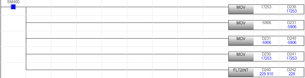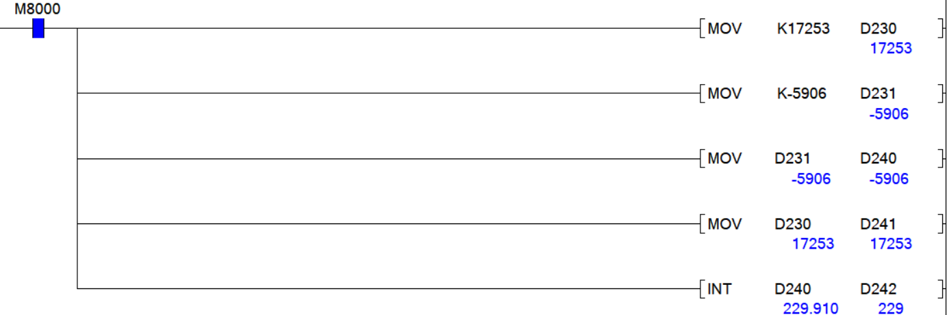 D230與D231的值要互換,你可以試試MOV D230 D241,MOV D231 D240,監視D240的值看是不是你要的數值