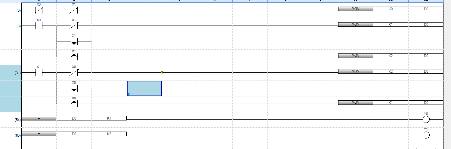 把x0  x1的開關(guān)和延信號,轉(zhuǎn)換為0和1,存入d,然后判斷d的數(shù)值