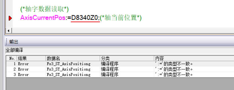 Works2的ST語言不支持定義D寄存器類型,類型不對不能代入,你這個只能用指令DMOV傳送類,不能用 := 代入數值。