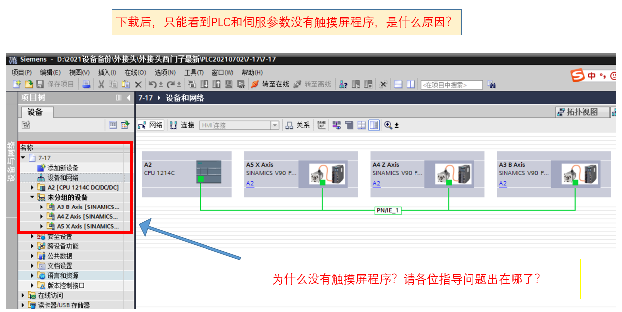 下載后,只能看到PLC和伺服參數沒有觸摸屏程序,是什么原因,請各位大師指導問題出在哪了?
