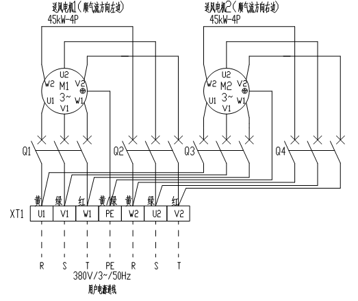 由于是風機,根據風量大小需要可調節,工頻以下運行,節能效果不錯,可以用兩個變頻器分別控制。