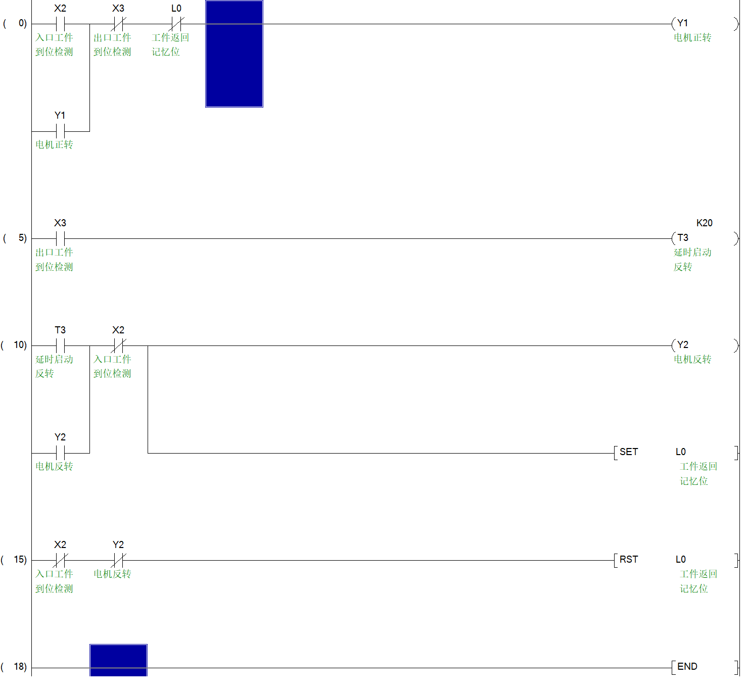 物件放在入口時,Ⅹ2導通,丫1正轉運行后,物件此時已離開了,此時x2沒有信號了,當物件運行碰到出口感應器X3時,x3導通后丫1停止,丫2反轉運行,反轉運行后,物件往入口方向運行,此時X3沒有信號了,當物件反轉運行碰到入口感應器x2時,觸發丫2反轉停止,當工人取出物件后,X2沒有信號了。這是一個動作過程。廠里機器有這個動作,所以想學習人家是怎么實現的。謝謝大家!