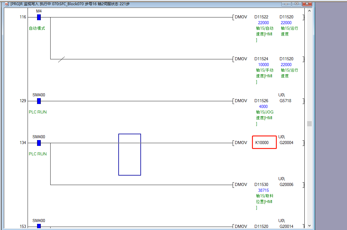。4.U0\G20004只在這一個地方寫了。5.速度寫進去,是沒有啟動?6.PLC本身的BUG?