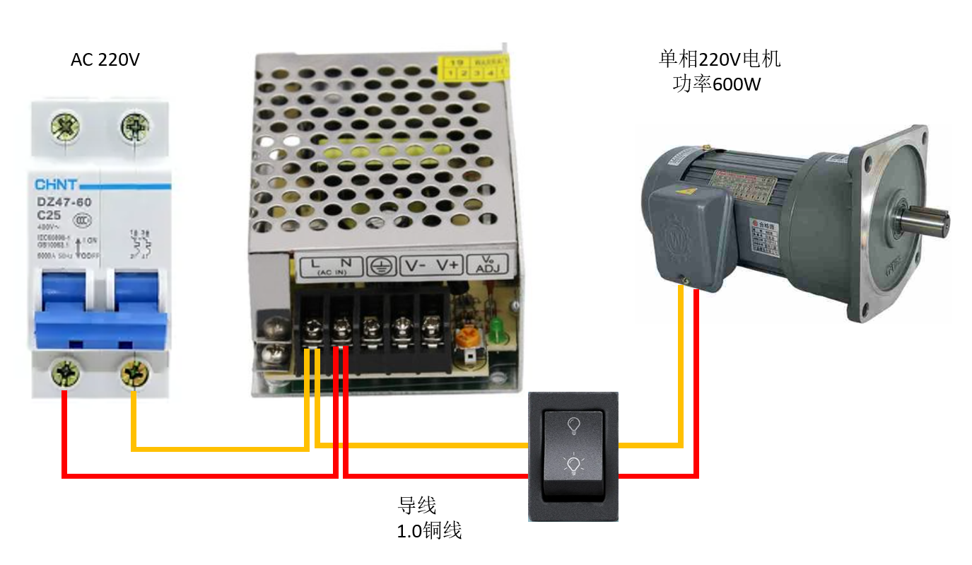 很簡單,你可以把開關電源L、N端到電機的并線接到空氣開關那里,就是空氣開關出兩組線,一組到開關電源,一組到電機,看看這樣開關電源還燒嗎?另外換一個靠譜的開關電源品牌,比如歐姆龍或者正品的明緯就用樓主圖示的接法,看看還會不會燒
