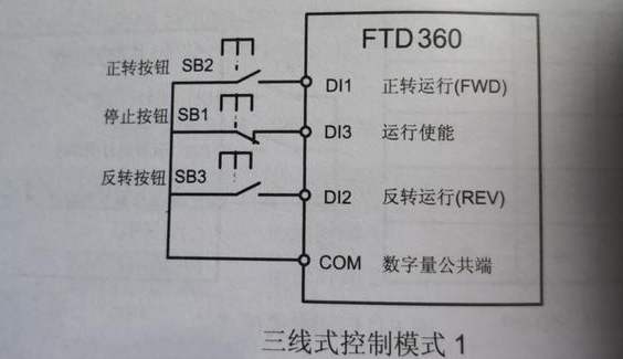 變頻器在起動電動機時,具有和接觸器控制電路類似的自鎖功能,有的變頻器在基本控制端子中設置了自鎖端子。有的變頻器則需要在多功能輸入端子中任選一個,預置為自鎖端子,如圖中X1端子。由于需要用三個端子(正轉、反轉、自鎖),故也稱為三線控制