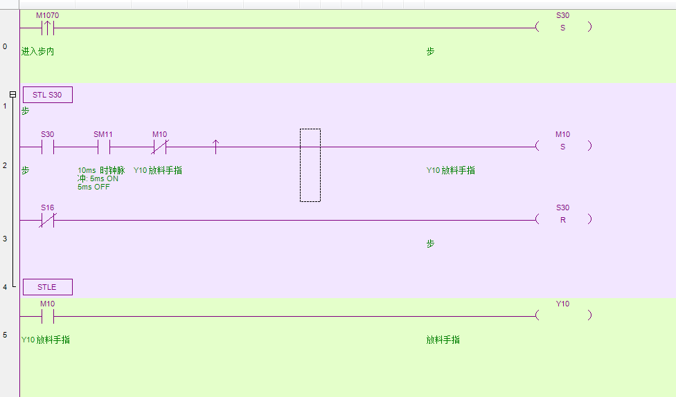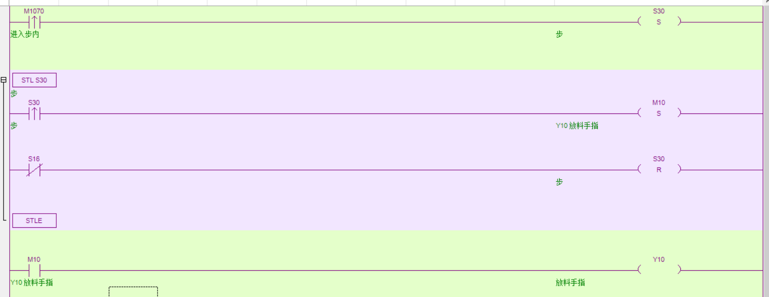這個很好理解啊,你看一下先后順序就行了。你先SET S30,S30接通瞬間是有一個上升沿,可是你有沒有發現,S30的上升沿是在S30的步里面,步里面的程序要步接通以后才能運行,所以就SET不了M10。你可以在步里面LD S30    TMR  T30 K1 K10(用一個延時讓它們的邏輯先后順序分明),然后LD T30 SET M10    RST S30。這樣百分之百不會有問題