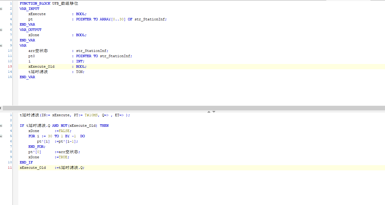 引用引用第1樓kyy80于2023-03-23 10:34發(fā)表的 :ELSIF NOT I_B_修改 AND NOT I_B_刪除 AND I_B_插入 THEN FOR I_TEMP:=49 TO (I_I_條目號+1) BY -1 DO IO_AR_數(shù)組.配方[I_TEMP] :=IO_AR_數(shù)組.配方[I_TEMP-1]; END_FOR; IO_AR_數(shù)組.配方[I_TEMP] :=I_D_數(shù)據(jù);.......