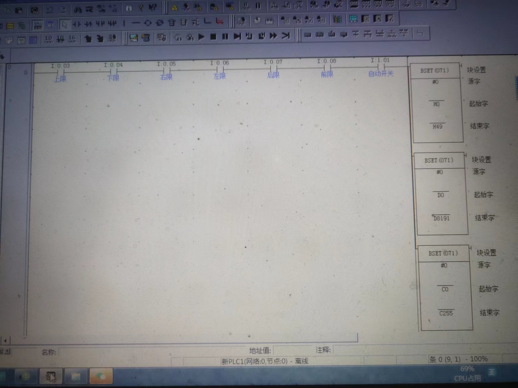 上限、下限、左限、右限、前限、后限常開都串在一起,條件都滿足,才能進行塊設置,也就是清零。實際幾乎不可能實現(xiàn),不明白。難道這臺機器限位接的都是常閉?
