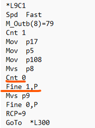 CNT 0我剛開始以為是光滑過度之類的命令,但是我一刪掉,不該動作的氣缸動作了,Fine 0,P是確認點到位嗎??