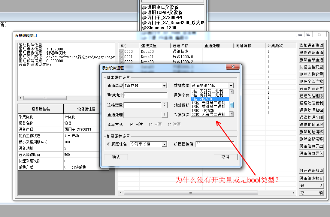 新款 沒有開關量,同一為整數,通道里面 0-7位就是bool型,多看看幫助,不想看,打官方電話