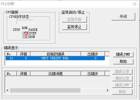 三菱 A系列PLC 型號A2SHcpu 選擇RUN,出現ERROR指示燈常亮,RUN(L.CLR)閃爍,PLC診斷顯示錯誤代碼31,UNIT VERIFY ERR.