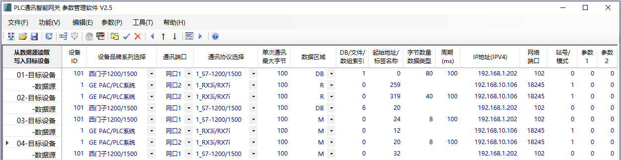 通過IGT-DSER的參數配置軟件(在附件中)配置PLC的通訊參數,包括寄存器起始地址、數量,以及PLC的IP地址、通訊端口協議等參數。以下是西門子PLC跟GE PLC之間的通訊數據配置: