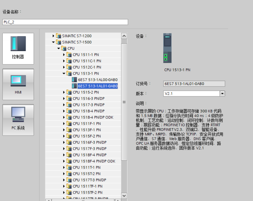PLC硬件上看到訂貨號是6ES7 513-1AL02-0AB0,在PLC組態時CPU 1513-1 PN里面沒有這個訂貨號的選項