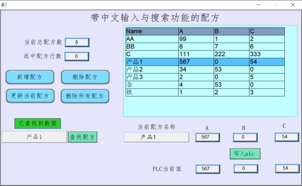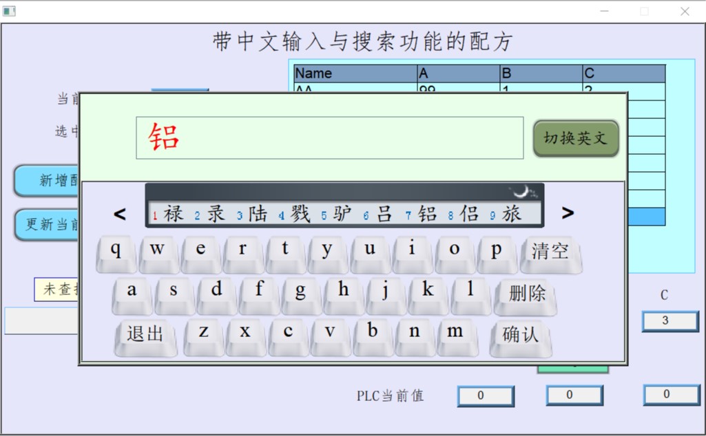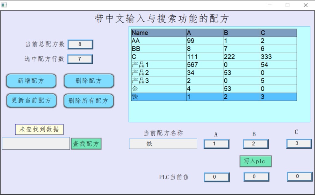 我這個程序案例也是根據網上大神開發的改的,可以輸入常用的漢字,支持中文+英文+數字+符號混合輸入。后來又加入了配方功能,可以輸入中文配方名,搜索中文配方,進一步實現了自動選擇配方數據。中文輸入與配方搜索功能都是用宏指令實現的,也方便移植到其他程序