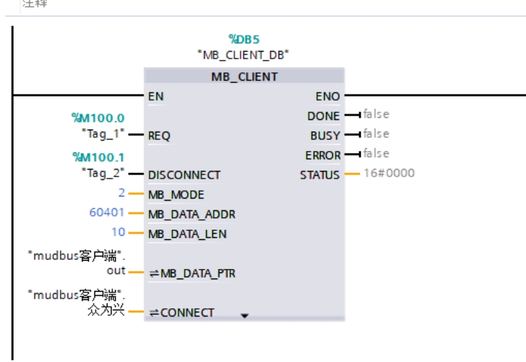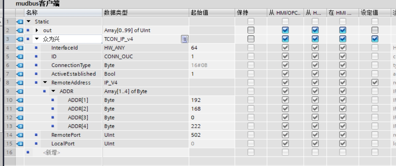 有臺1200跟眾為興做標準modbus TCP/IP協議,現在一直連接不上,請高手幫忙看下是不是設置不對?我需要往眾為興地址60401里面寫數據進去。