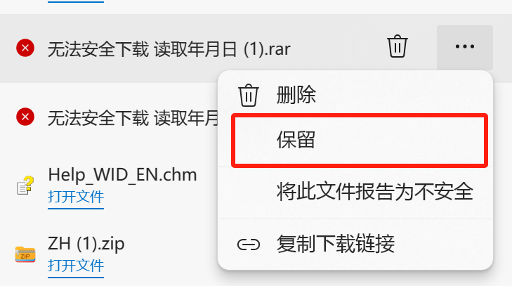 使用Edge瀏覽器會提示無法安全下載,點擊保留即可下載。