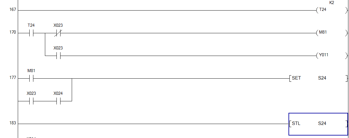 T24是定時器,后面跟K十進制數值配合使用,程序是T24 K2就是定時2*0.1=0.2秒;STL24是步進圖序號