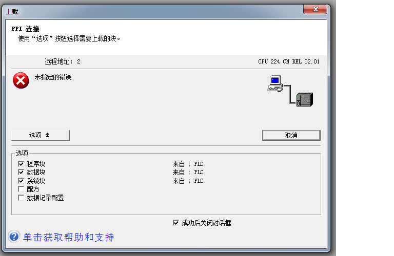 幾臺設備用的是西門子S7-200,CPU224CN,現在有一臺出現一個繼電器觸點粘連的現象。想重新編程換個通道。但是電腦聯機上載程序進度完成后出現“未指定的錯誤”的提示。