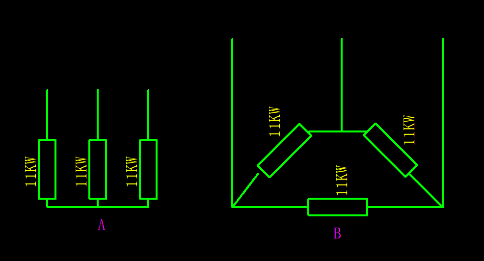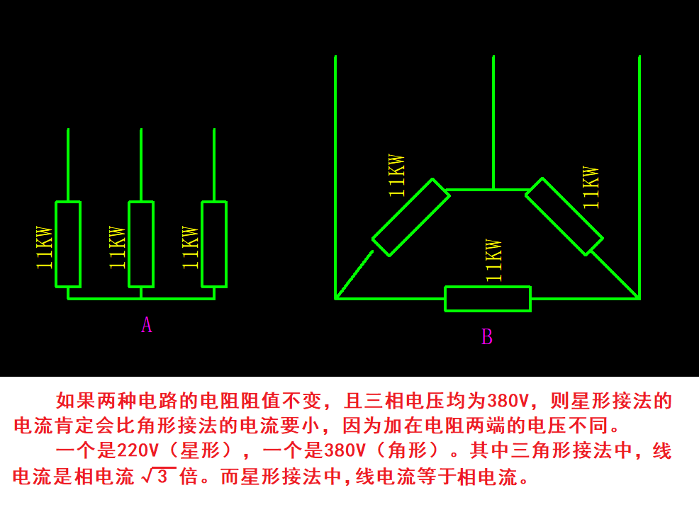 一個(gè)是星形接法,一個(gè)是三角形接法。如果都是三相380供電,三根電阻阻值相等的話,星形接法電流等于220v除以電阻。三角形接法是380v除以電阻