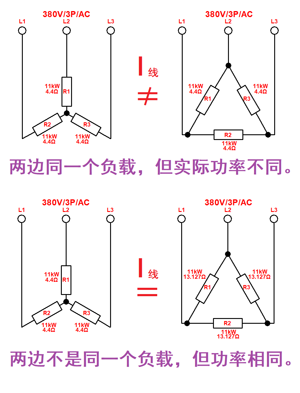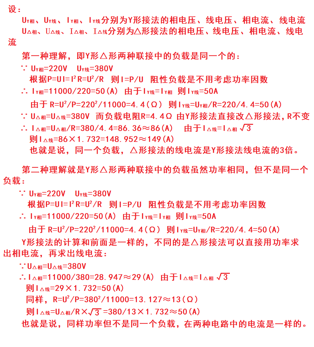 對(duì)于初入行或者電工基礎(chǔ)不好的人來說,其意思是星形接法下11kW的阻性負(fù)載,直接將其改接為角形聯(lián)接接在同樣的三相380V的電源上,電流如何計(jì)算?由于出題人是初入門或者電工基礎(chǔ)不好的人,認(rèn)為星形接法為11kW,那角形接法時(shí)仍為11kW,不知道同一負(fù)載在不同的電壓下功率也是不同的。