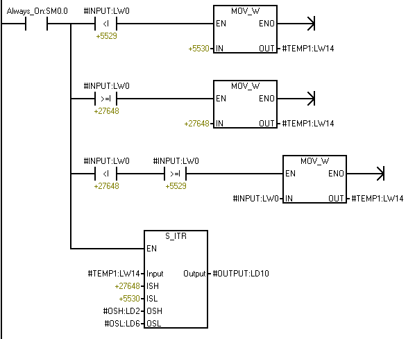 然后剩下的就是按比例換算就可以了,這個需要自己去換算。做程序的話還需要用到整數(shù)I轉(zhuǎn)實數(shù)R。模擬量輸入輸出都是一個字(長度為W(=Word))的整數(shù) I(=int),實際工程量是會有小數(shù)點的,所以需要先把 I 擴展到雙字的DW(=double Word),然后轉(zhuǎn)換為實數(shù)R(=Real),之后的計算就用實數(shù)運算指令進行比例運算就行了,最終結(jié)果就是測量值。