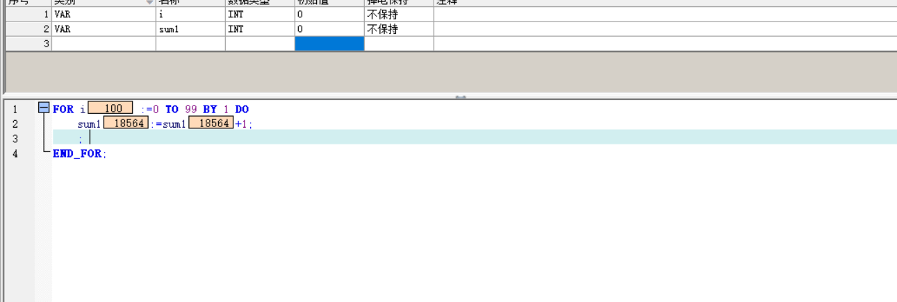 每個(gè)掃描周期都會(huì)給 sum1 增加 100(執(zhí)行 100 次 sum1:=sum1+1) ,i跟sum1有什么關(guān)系 你要是只在循環(huán)那應(yīng)該是Sum1=i+1 用那個(gè)循環(huán)的i,而不是sum1加呀,sum1等于是這個(gè)程序塊的全局變量,