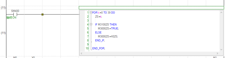 內嵌ST!如果M3100Z0為ON則M3000Z0=M3100Z0;如果M3100Z0為OFF則M3000Z0=X0Z0,循環賦值,不知道對不對?