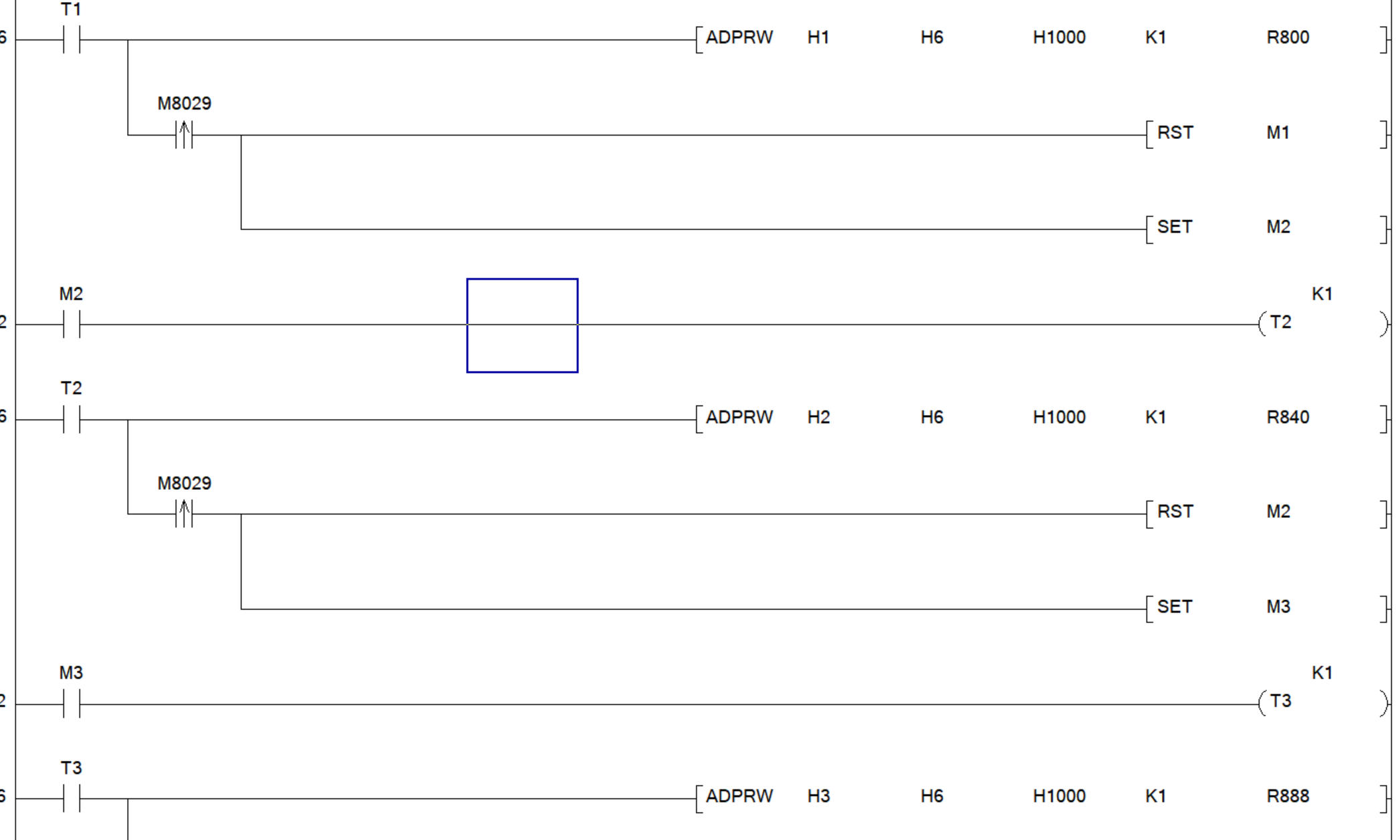 H1000和H1001看了手冊知道應該是變頻器地址,在現在的程序里作用是頻率寫入和讀取,但用的是兩臺三菱F700和一臺TMSKO變頻器,跟說明書地址也對不上,關鍵是還能正常運行。這三臺除了站號分開了,地址都用的H1000和H1001,也沒看到變頻器這邊有設置地址的參數