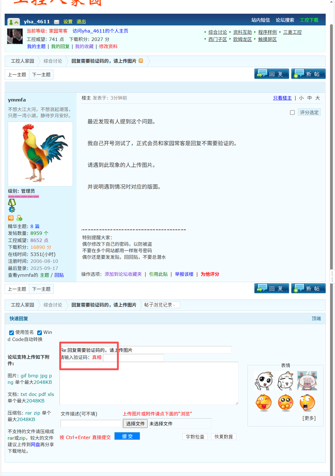 引用引用樓主ymmfa于2025-09-17 14:14發(fā)表的 回復(fù)需要驗證碼的,請上傳圖片 :最近發(fā)現(xiàn)有人提到這個問題。我自己開號測試了,正式會員和家園常客是回復(fù)不需要驗證的。請遇到此現(xiàn)象的人上傳圖片。.......
